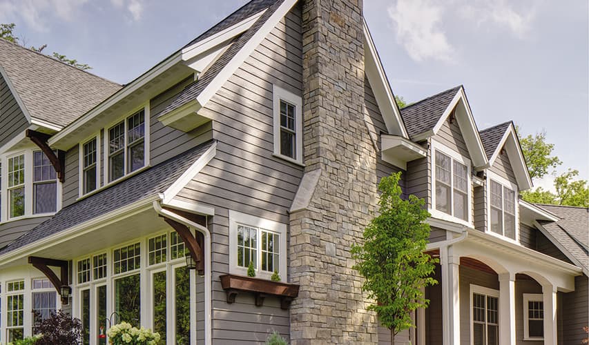 James Hardie Cedarmill Lap, Board and Batten, and Straight Shingle Siding in ColorPlus finish with Arctic White trims and corners